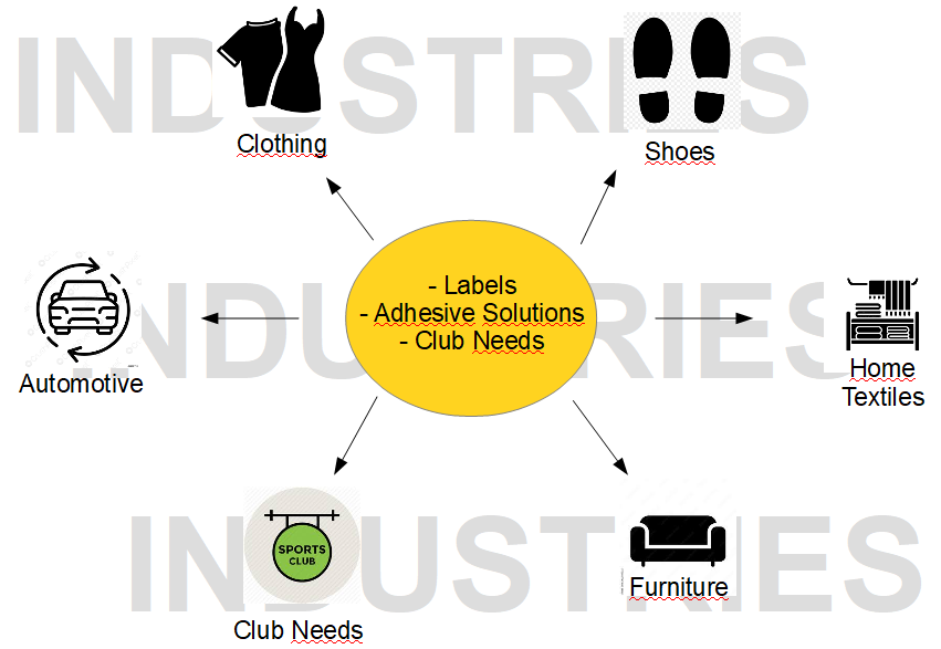 Die Darstellung des Markennamens ist eine der Hauptideen für die Verwendung von Etiketten. Neben Marketing können viele andere Funktionen in das Etikett integriert werden : es kann eine Informationsplattform sein die Text, Waschanleitung, Materialzusammensetzung enthält wie auch viele andere Inhalte. Logostic-Funktionen wie Produktverfolgung mit Barcodes oder Seriennummern sind ebenso möglich wie die Funktion, dem Produkt einen optischen Akzent zu verleihen. Das Branchenspektrum mit Etiketten ist breit gefächert: Textillogistik, Bekleidungs- und Schuhindustrie sowie Heimtextilien z.Bsp. Matratzen, Kissen, Möbel und noch viele andere.